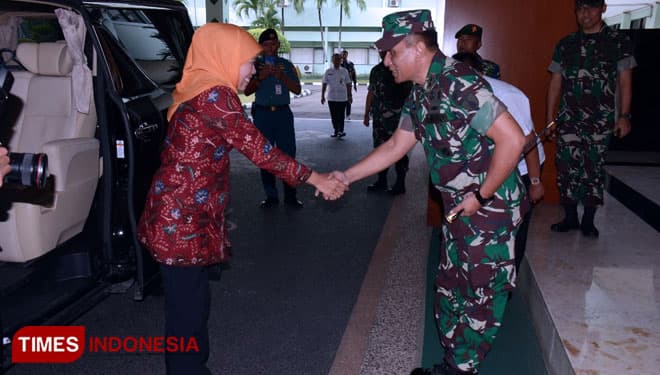TIMES Sleman/Pangdam V/Brawijaya, Mayjen TNI Wisnoe, P.B, menyambut kedatangan Gubernur Jatim, Khofifah Indar Parawansa di Makodam V/Brawijaya, Rabu (20/2/2019).(Foto: Istimewa)