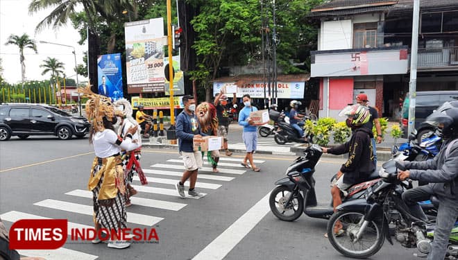 BANTUL – Paguyuban Skuter Bantul bersama Paguyuban Seniman Bantul menggelar aksi penggalangan donasi untuk korban erupsi gunung Semeru. Penggalangan dana dilakukan dengan menampilkan kesenian Gedruk Krincing di perempatan Klodran Bantul, Sabtu (11/12/2021). Sambil menari beberapa seniman yang memakai kostum wayang mengedarkan kotak donasi kepada pengguna jalan.